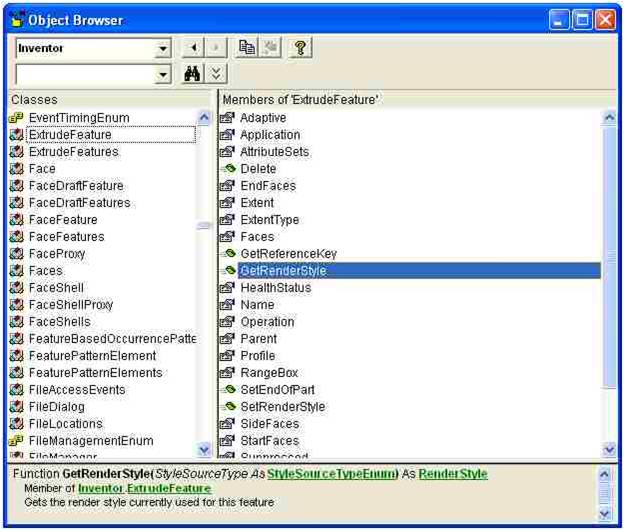 Inventor API Programming Help (click to expand in a new window) - Object Browser – The object browser is a user-interface for viewing the objects and their associated methods and properties. Object browsers exist in various forms in the different languages but the object browser that's part of VBA is probably the best for viewing Inventor's objects. From within VBA you show the object browser by running the Object Browser command (F2). The drop-down in the upper-left of the Object Browser dialog lets you choose which programming library you want to view. The field below that allows you to search the library. The dialog contains two main areas. The one of the left is a list of all of the objects in the selected library. When you select an object, the area on the right shows the methods and properties of that object. Selecting a method or property will display specific information about it at the bottom of the dialog.