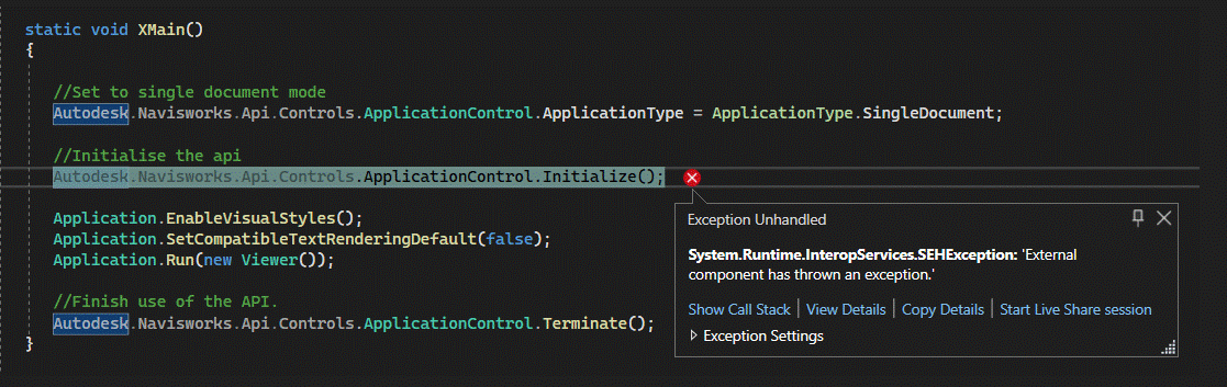 Autodesk.Navisworks.Api.Controls.ApplicationControl.Initialize();